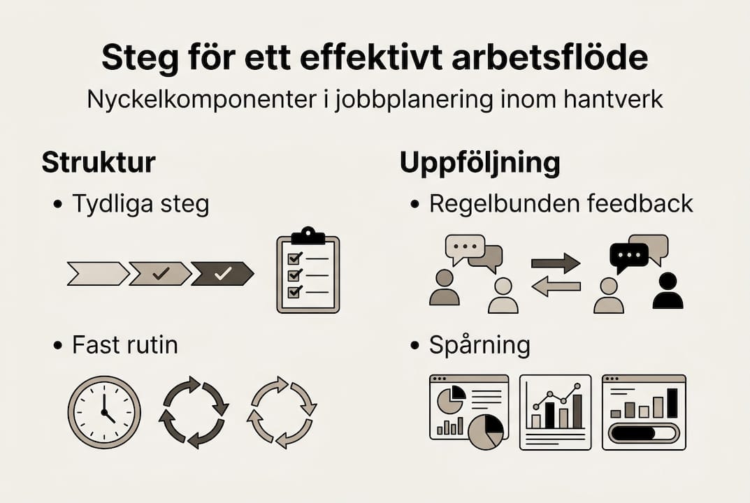 Varje timme du lägger på att jaga information, rätta dubbelbokningar eller svara på otydliga förfrågningar är en timme du inte fakturerar. För många elektriker, rörmokare och byggföretag är det precis den verkligheten. Jobbplaneringen fungerar, men knappt. Det kostar pengar, skapar stress och gör att bra kunder ibland faller mellan stolarna. Med ett strukturerat arbetsflöde kan du vända den trenden. Du sparar tid, minskar missförstånd och ökar lönsamheten utan att behöva anställa fler. Den här artikeln ger dig en konkret guide för hur du bygger, förbättrar och underhåller ett arbetsflöde som faktiskt fungerar i vardagen.